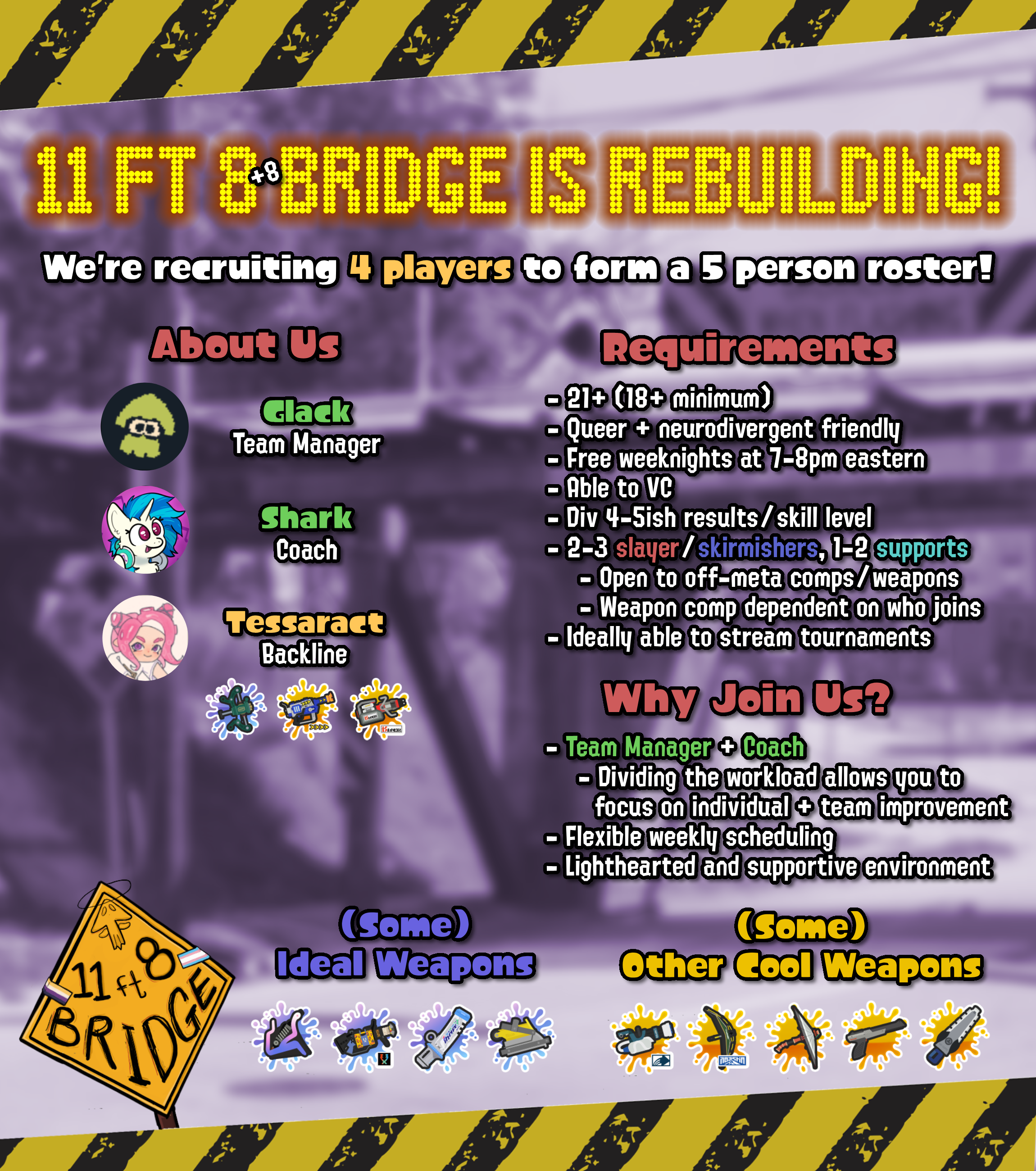 If you think you play something that’d mesh with the team, please apply! We aren’t looking to gatekeep weapons by any means. Do note that as ther roster is fleshed out, the scope of what we’re looking for will narrow (though there will be some redundancy with a 5 person roster).